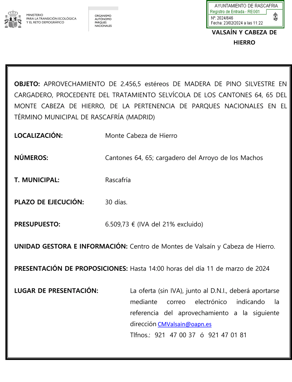 Anuncio sobre Aprovechamiento de un lote de madera de pino silvestre en cargadero procedente del tratamiento selvícola realizado en los cantones 64 y 65 del Monte Cabeza de Hierro, de la pertenencia de Parques Nacionales en el Término Municipal de Rascafría